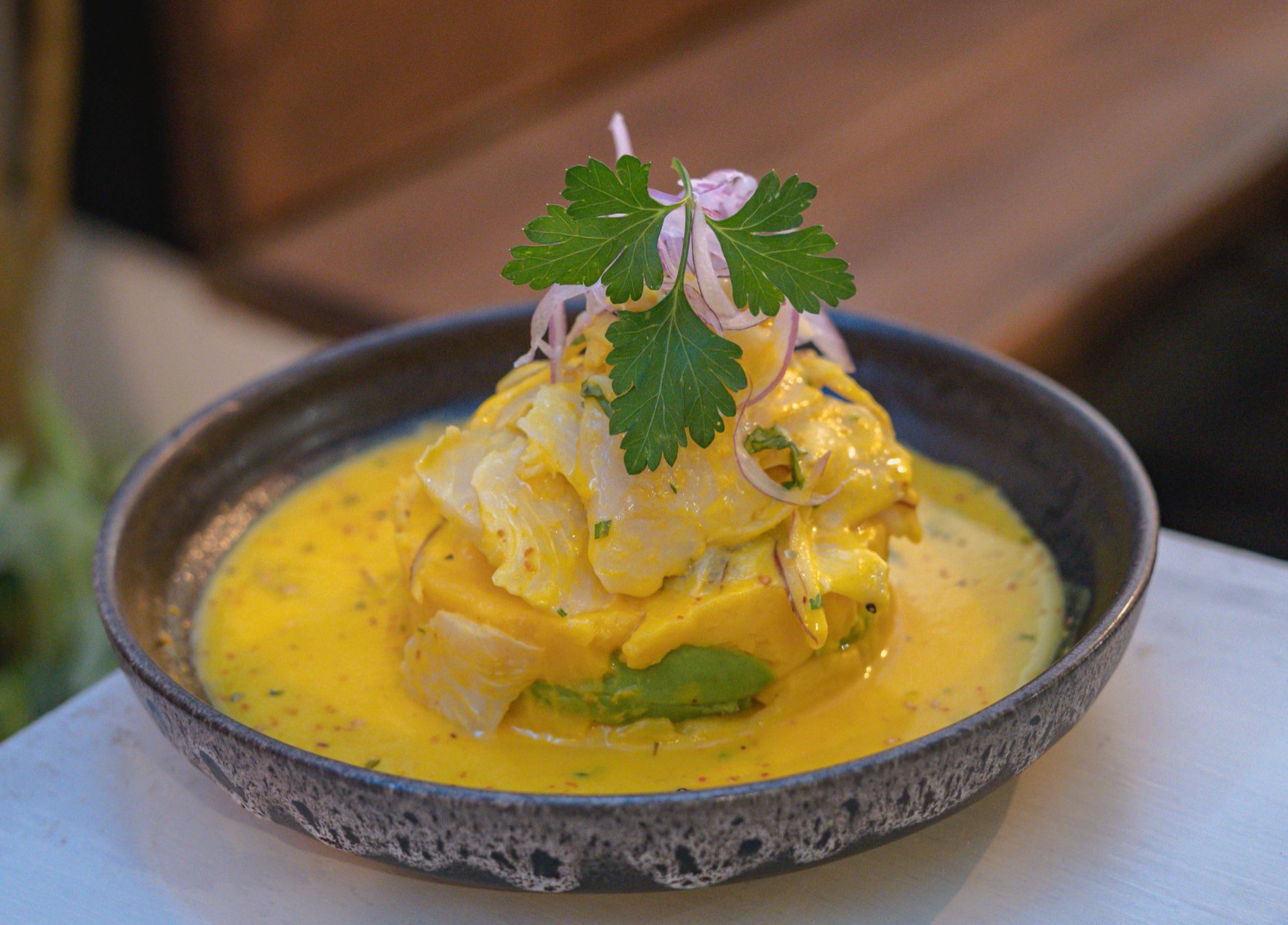 Masa de patata prensada aderezada con crema de ají amarillo y zumo de lim, rellena de aguacate, coronada con ceviche en leche de tigre de ají amarillo y sin sal