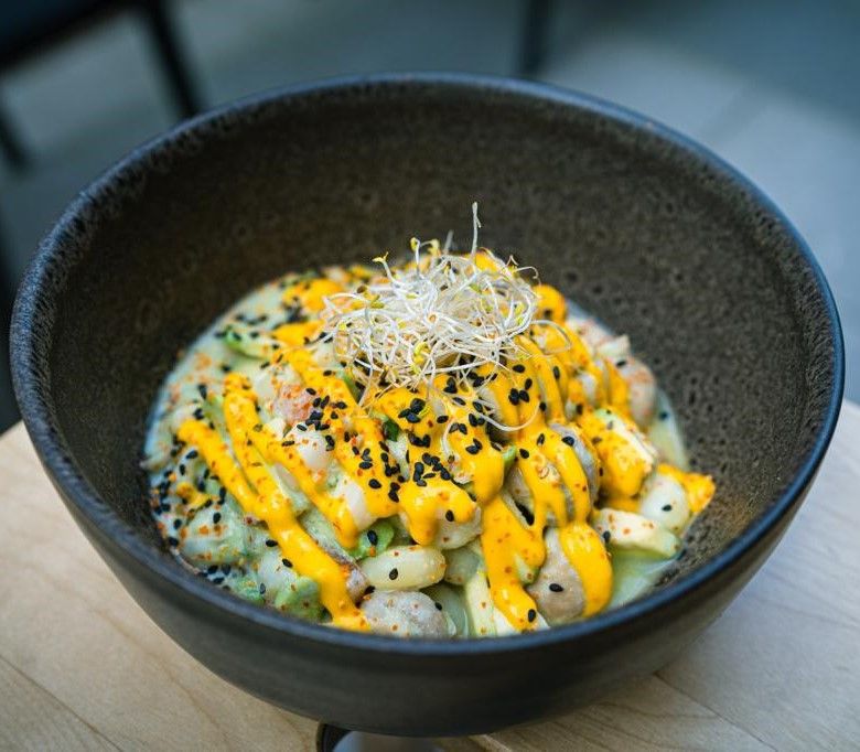 Masa de patata prensada aderezada con crema de ají amarillo y zumo de lima, pulpo adobado en aceite de oliva, vinagre y orégano. Acompañado de aguacate, mayonesa de aceituna botija, huevo cocido, tomate cherry y brotes picantes.